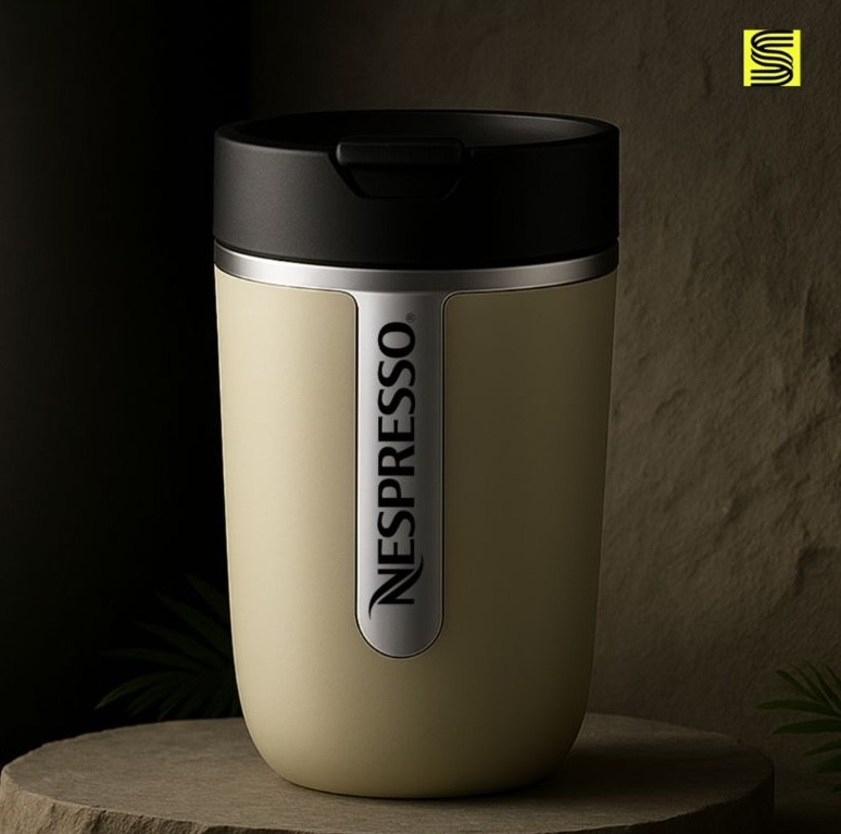 Travel Mug hecho de acero inoxidable con tapa antiderrame. Material resistente a caídas y abolladuras.